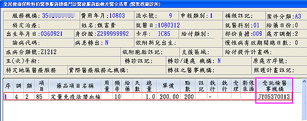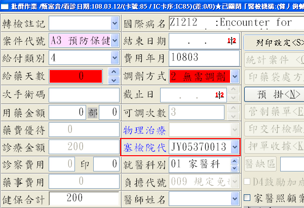 ● IC85糞便潛血檢查(大腸癌篩檢)申報案件,如下圖示,於批價作業畫面會顯示設定完成醫檢代碼