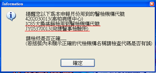 相關案件申報的醫檢所代號提示畫面,請用戶加強確認各代碼是否正確無誤