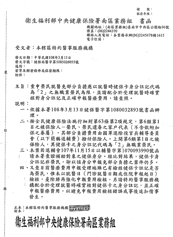 重申榮民就醫免部分負擔應以就醫時健保卡身分註記代碼為2之無職業榮民為限,請院所於受理就醫時確實核對身分註記及正確申報醫療費用
