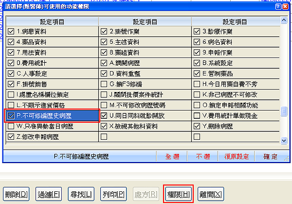 操作說明:於『C人事資料』畫面的『權限』內『P.不可修編歷史病歷』做勾選即可,如下圖示