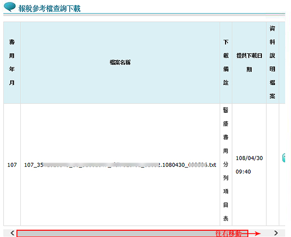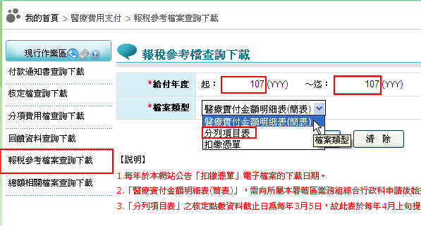『給付年度』(例如:107~107)/『檔案類型』(例如:分列項目表)