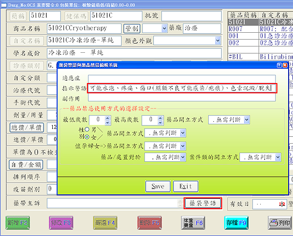 2. 於要設定列印項目內,點選「藥袋警語」如下圖示,輸入需印出內容再按下「Save」
