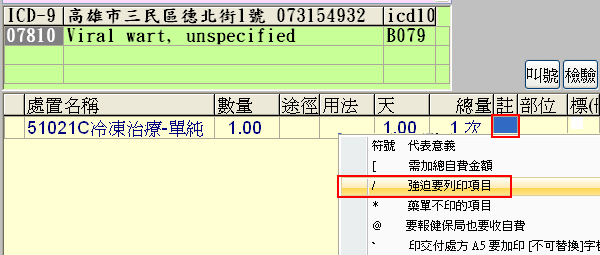 3-2. 要自行決定當次是否加印,於處置項目右側「註」字欄位,按滑鼠右鍵點選「/」即可