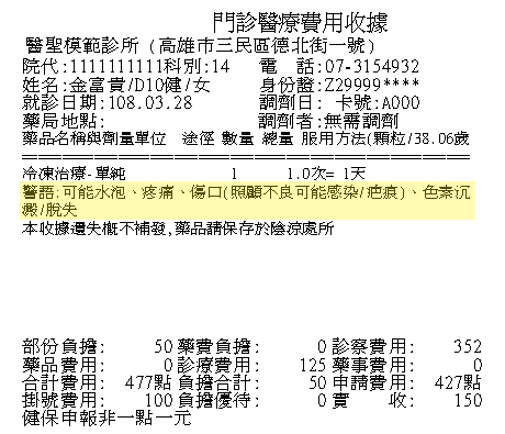 藥單收據警語加印抬頭名稱(藍字)列印顥示如下: