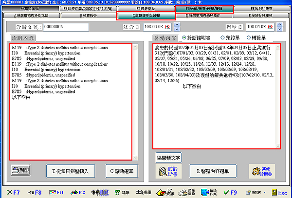 更版說明:因應用戶反應診斷證明書固定A4格式列印時,診斷病名及醫囑內容超出一定行數長度時無法單頁完整印完,新增公版格式可依據輸入診斷病名及醫囑內容(紅框處)自動調整印出。
