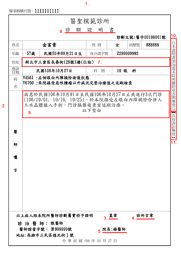 如下圖示,參數設定完成的顯示範例結果如下圖公版診斷證明書依數字編號對應位置