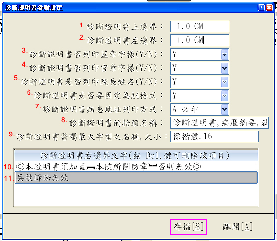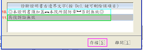 註3) 第10.11.項 診斷證明書右邊界文字可依院所需求自定修改,若不列印刪除該行即可