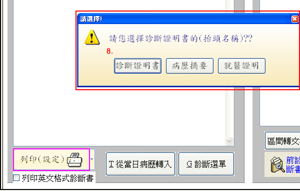 註1) 第8項 診斷證明書的抬頭名稱可自定三組,列印時會出現選單,如下圖示