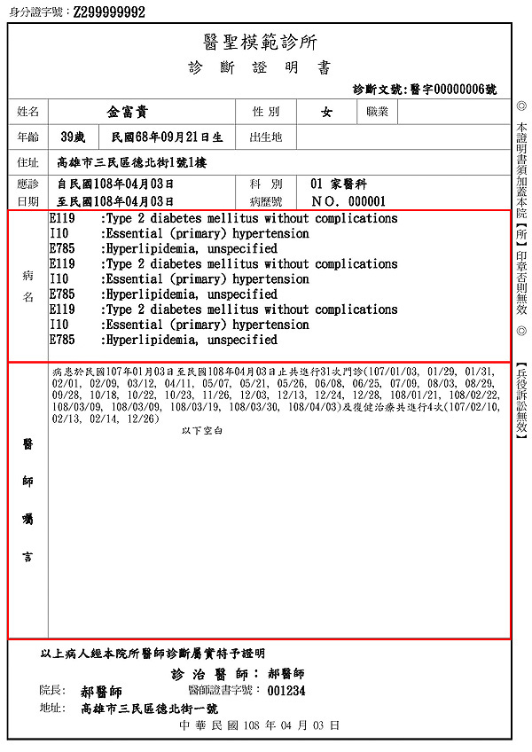 功能說明:因應用戶反應診斷證明書固定A4格式列印時,診斷病名及醫囑內容超出一定行數長度時無法單頁完整印完,新增公版格式可依據輸入診斷病名及醫囑內容(紅框處)自動調整印出。