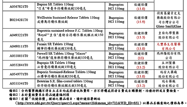 一、"信東"布憂平持續藥效錠150毫克(Bupion SR Tablets 150mg,信東生技股份有限公司)補助額度由15.5元調整為13.8元。