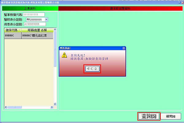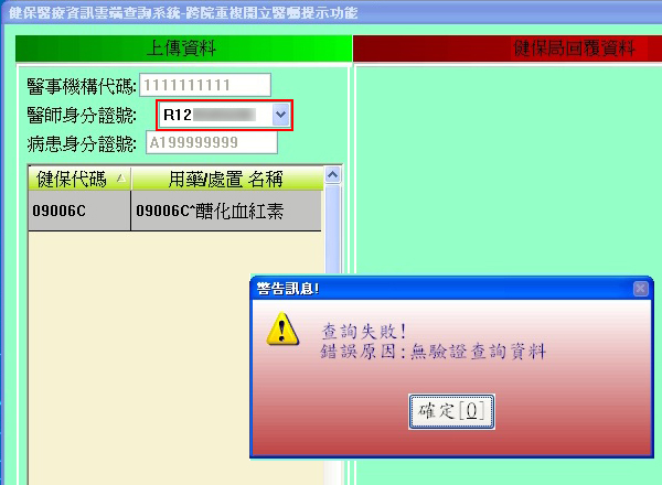 但查詢雲端藥歷使用的為當診醫師卡,因此兩者不一致會出現無驗證查詢資料(失敗)