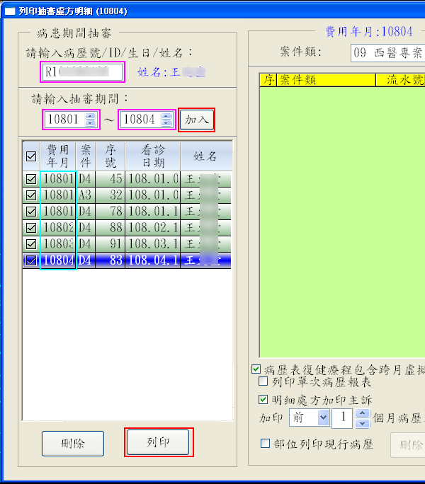 異動說明:於列印抽審處方明細視窗,原左側『一般案件』區修改為『病患期間抽審』功能區