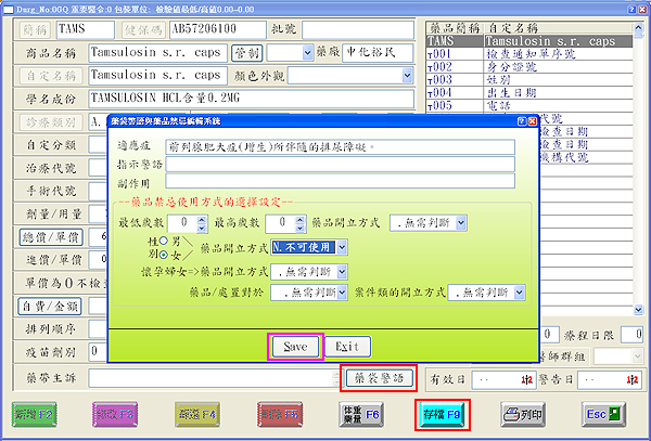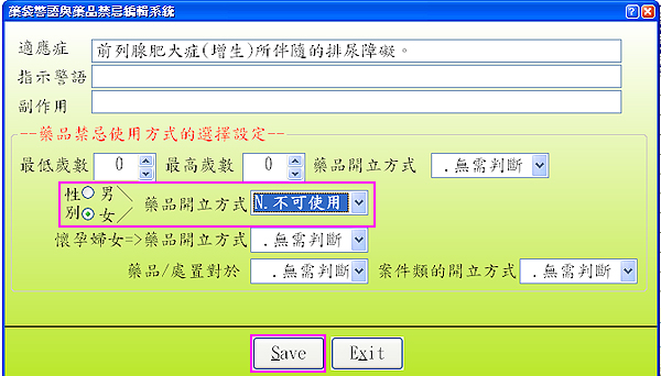 「性別」點選「女」-「藥品開立方式」點選「N.不可使用」-再按下「Save」