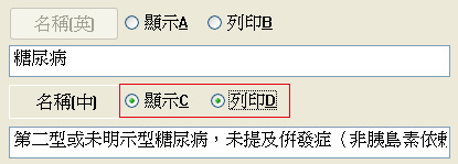 在「ICD-9」欄位診斷病名上用滑鼠左鍵連續點兩下,可直接開啟病名編輯畫面,在該筆病名名稱(中)「 顯示 C」 及「列印 D」前方做點選即可。