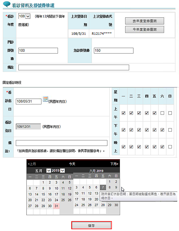 VPN首頁/服務登入/醫務行政/看診資訊及掛號費維護專區/依登錄需求至下述欄位中鍵入相關資料/儲存。