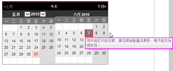 ※ 用滑鼠左鍵點選黑底日期表示該日為院所特休日 ※