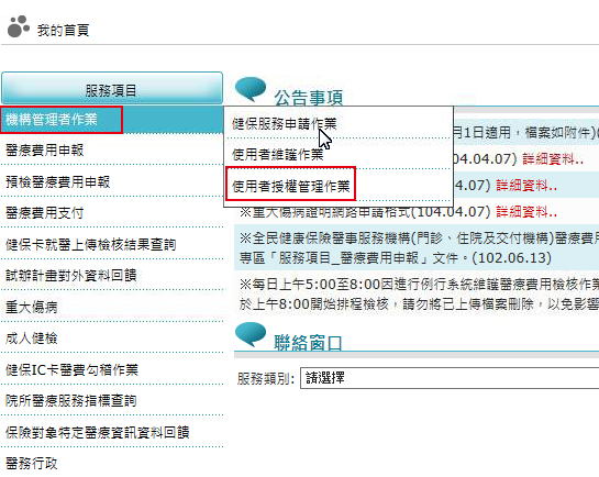 步驟二、可授權者登入後請點選「服務項目:機構管理者作業」之「使用者授權管理作業」功能