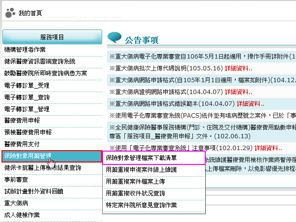 步驟三、用滑鼠左鍵點選『保險對象用藥管理』再點選『保險對象管理檔案下載清單』功能