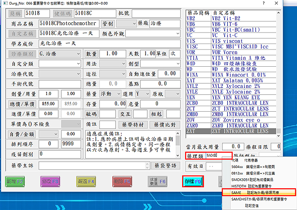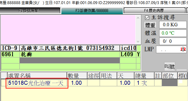 於「F3診療作業」畫面,輸入同療相關診斷及當次治療處置、藥品,再按下「vF9」批價存檔即可。
