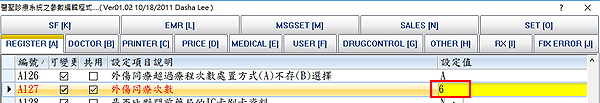 於上方點選參數標籤「REGISTER [A]」於下方尋找編號A127「外傷同療次數」
