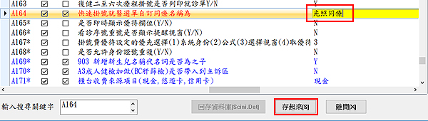 於上方點選參數標籤「REGISTER [A]」於下方尋找編號A164「快速掛號就醫選單自訂同療名稱為」右方設定值改為「光照同療」或「○○同療」再按下「存起來」「離開」,退出醫聖系統再重新進入即可生效。註:預設值為「外傷同療」。