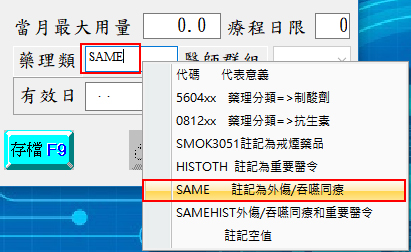 出現如下圖選單,點選「SAME」代碼後,再按下「F9存檔」即可。