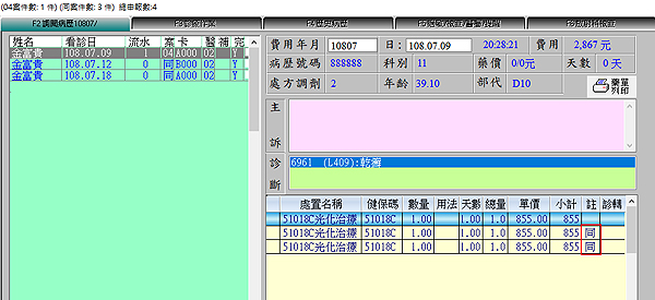 右側註記『同』表示為掛入同一療程內的診斷處置於執行申報時合併至第一筆項目