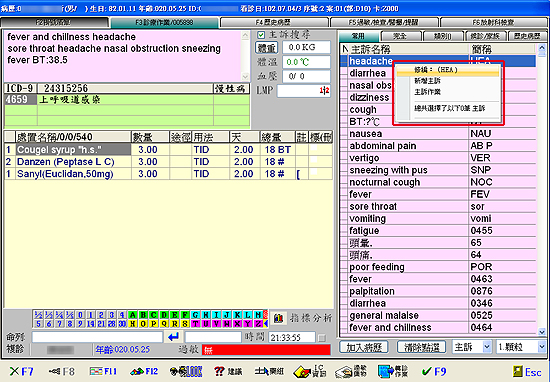 操作說明:於『F3診療作業』右方「主訴分類」處按下滑鼠右鍵,可開啟如下圖畫面選單