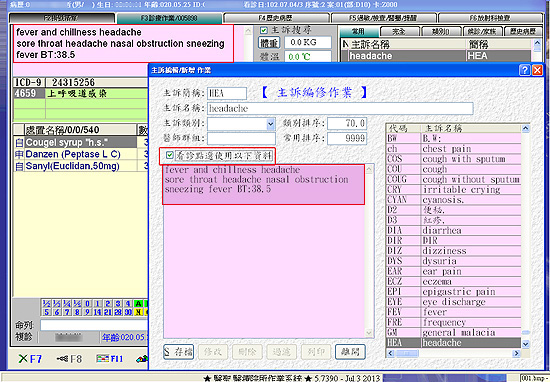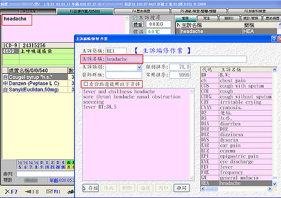 ↓ 輸入主訴簡稱「HEA」自動帶入「看診點選使用以下資料」區建立完成主訴內容