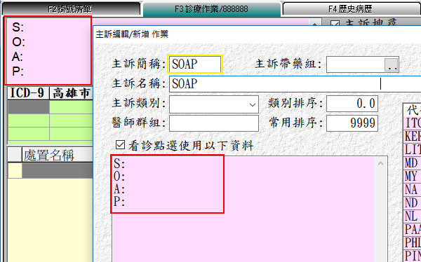 2. 於主訴編輯視窗(粉紅區塊處)輸入簡稱「SOAP」再按空白鍵,也會自動帶出已建立完整主訴 (如下圖)