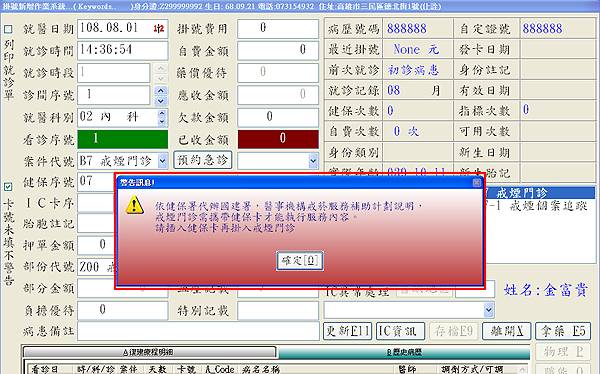 因不准許異常掛號,未使用健保卡點選『07 戒煙門診』掛入時,會出現如下圖警告視窗