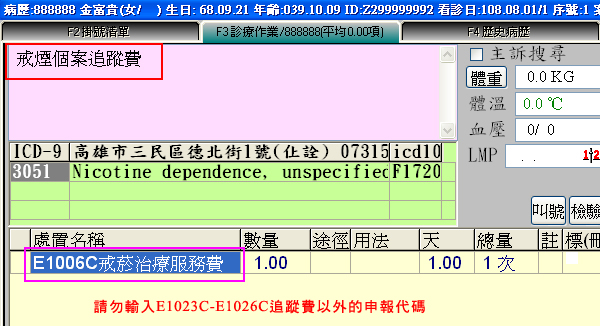 點選『07-1 戒煙個案追蹤』掛入時,於主訴區會帶入提醒文字,提醒本筆為申請戒菸個案追蹤費