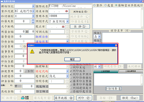 於批價存檔時亦設定提醒機制,提醒用戶不要誤輸成戒菸用藥或衛教處置申請內容(因此筆未過卡)