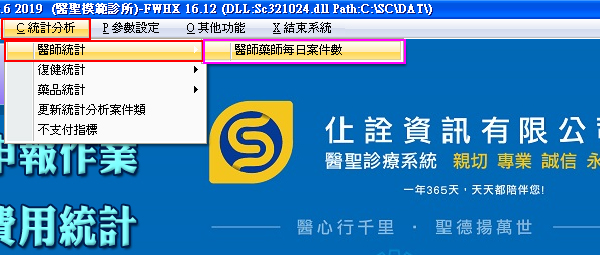 方式1、於主畫面『功能選項列』點選『C 統計分析>醫師統計>醫師藥師每日案件數』功能查閱