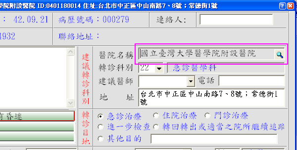 ● 於『轉診作業系統』如下圖示,醫院名稱有指定病患要前往轉診的院所名稱時