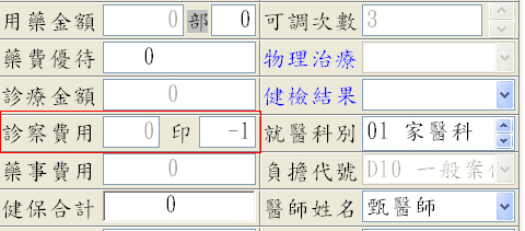 於批價作業畫面,如下圖示處,該筆病歷『診察費用』欄位右方「印」欄位空格輸入「-1」即可。