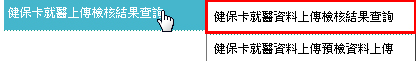 使用『服務項目>就醫資料上傳檢核結果查詢>健保卡就醫資料上傳檢核結果查詢』(如下圖示)