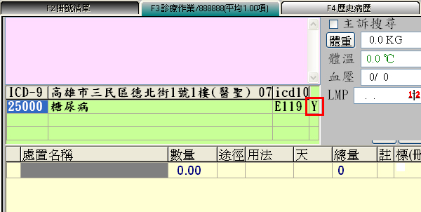 操作說明:診斷區(綠底)病名右側為『Y』(下圖紅框處)者,系統即判斷此診斷碼為慢性病病名