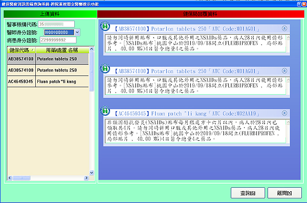 另於108年9月23日新增「資料類別:5(非類固醇抗發炎劑藥品)」主動提示功能,未來將比對非類固醇抗發炎(NSAIDs)貼布、軟膏、口服之範圍用藥紀錄,且該範圍28日內之用藥紀錄醫令總量大於0者,回饋提示訊息如下: