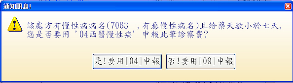 更版功能:新增設定有西醫慢性病名且給藥天數小於七天以下,自動以04或09案件申報不再詢問