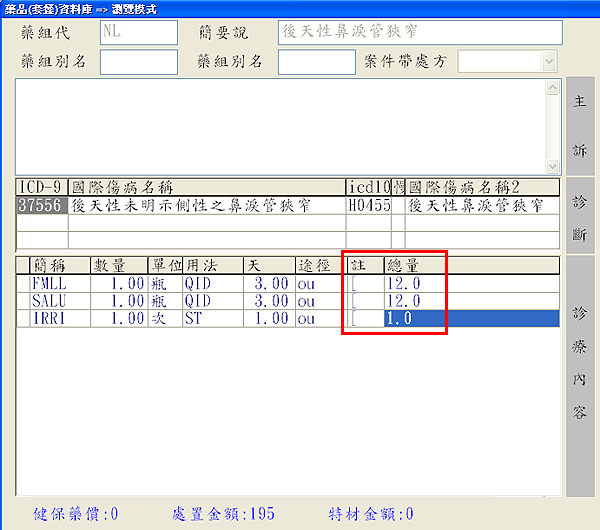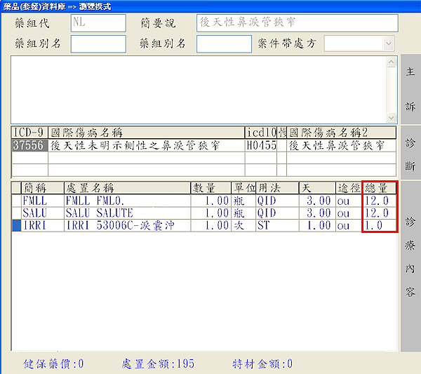 『 8 藥組資料』診療內容區內的「總量」欄位,因版面欄寬位置要向右移動欄位才看到