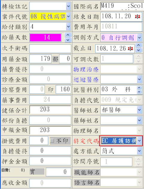 (3) 慢連箋第二、三次調劑,案件分類08,分二筆申報,任一「特定治療項目代號」欄位應為「EC」(全民健康保險居家醫療照護整合計畫)。