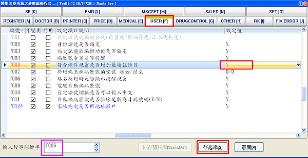 於上方點選參數標籤「USER [F]」於下方尋找編號F006「符合條件視窗是否增加最後就診日」