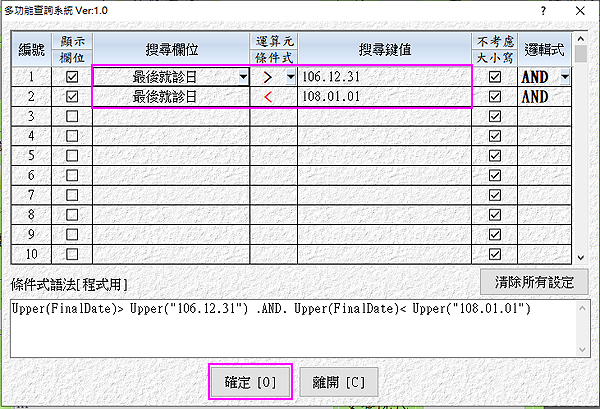 欄2『搜尋欄位』點選「最後就診日」、『搜尋條件』點選「<」、『搜尋鍵值』輸入「108.01.01」