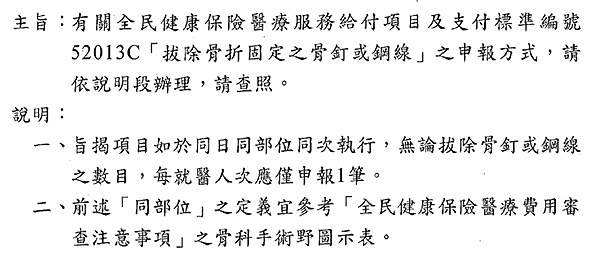 有關52013C拔除骨折固定之骨釘或鋼線之申報方式說明