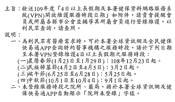 109年長假期VPN登錄開診時段時程