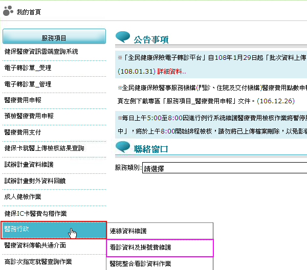 步驟二、登入成功後,請點選「服務項目:醫務行政」之「看診資料及掛號費維護」功能