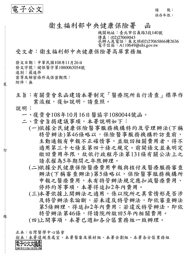 函復有關建請制定「醫療院所自行清查」標準作業流程