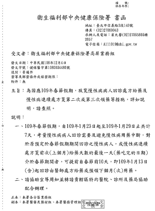 因應109年春節假期,放寬慢性病病人回診及慢連箋等領藥措施說明