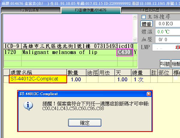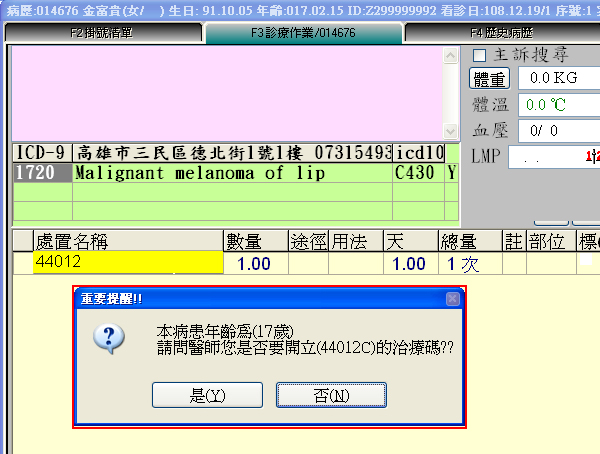 於『F3診療作業』畫面,看診醫師鍵入處置項目(44012C)時,即會跳出提醒文字視窗
